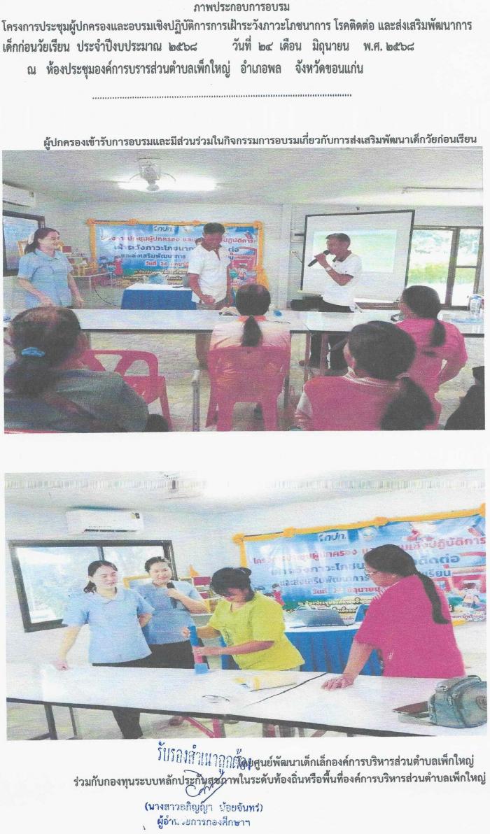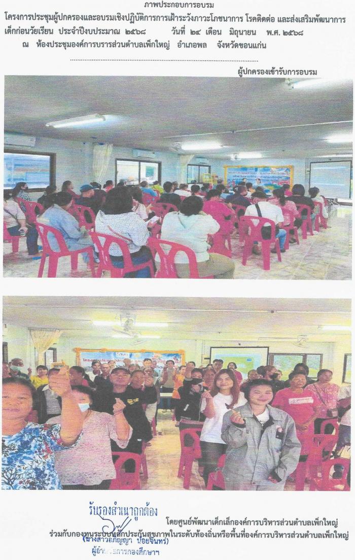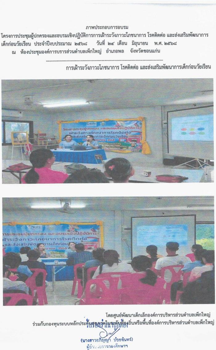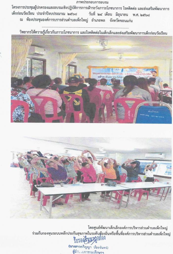 กองทุนระบบหลักประกันสุขภาพในระดับพื้นที่องค์การบริหารส่วนตำบลเพ็กใหญ่ อุดหนุนเงินให้กับศูนยพัฒนาเด็กเล็กองค์การบริหารส่วนตำบลเพ็กใหญ่ เพื่อดำเนินโครงการโครงการประชุมผู้ปกครองและอบรมเชิงปฏิบัติการการเฝ้าระวังภาวะโภชนาการ โรคติดต่อ และส่งเสริมพัฒนาการเด็กก่อนวัยเรียน ประจำปี 2568